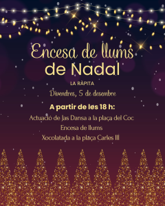 La regidora de Comerç, Helena Queral, ha anunciat que aquest divendres 5 de desembre, a les 18 h, la plaça del Coc acollirà l’encesa de llums que donarà el tret de sortida al Nadal rapitenc. L’acte comptarà amb xocolatada gratuïta i una actuació de Jas Dansa.