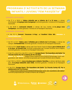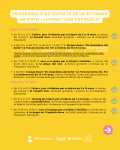 L’Ajuntament de la Ràpita ha programat una nova edició de la Setmana Infantil i Juvenil “Fem Pasqüeta”, una proposta adreçada a infants, joves i famílies que se celebrarà del 28 de març al 2 d’abril amb un ampli ventall d’activitats repartides en diferents espais del municipi. L’objectiu és oferir una alternativa d’oci durant els dies de Pasqua amb propostes lúdiques, educatives i accessibles per a totes les edats.